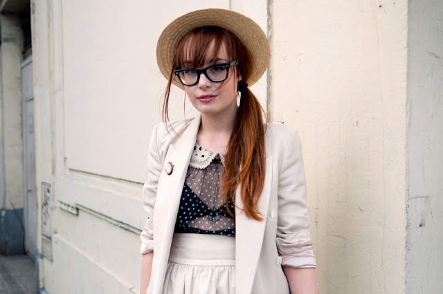 Where did this photo come from? I'm sure I took it from a street-style fashion blog. Wayne Tippets? Polka Dot? the Streethearts? For the life of me, I can not remember, but I do remember uttering a big sigh when I caught sight of her. PERFECTION. She is funky, sweet looking and so friggin' stylish. Wearing essential elements of the moment: a straw boater (the hat of the summer), sexy big glasses, a rad white suit, "boyfriend" jacket, sheer top, lace trim, polka dots. In short she IS fashion, summer of 2010, without the slightest hint of try-to-hard. She looks fresh, and makes it all seem so effortless.