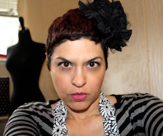 Target stores are dangerous places. At least on the pocketbook. I'll go in for cat food & kitty litter and scotch tape and leave with a killer pair of shoes, a dress, a new lipstick, an impulsively picked plant for the garden, will have forgotten the much needed scotch tape, and have a much thinner wallet. D-a-n-g-er-o-u-s. But, I do love that store. In fact most items in above outfit have been acquired from the tempting Tar-jay. The grey & black striped sweater, the strappy black leather gladiator heels and JPG halter dress are all Target purchases. The sweet little floral headband is from Forever 21, another dangerous place to visit on payday. The polka dot sleeveless slip (really a skirt hiked up really, really high), the polka dot purse & striped cotton socks are thrift store finds.
