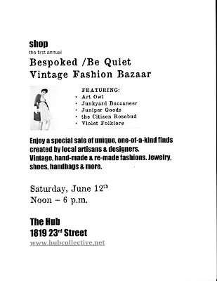 Recently I've been busy planning a crafty/vintage sales Bazaar featuring local artisans/ vintage enthusiasts for the HUB, the sweet little community hot-spot for all sorts of casual get-togethers, including live music, art and writing workshops, among other things. One thing is going to be this fun shin-dig: the first annual Bespoked/ Be Quiet Vintage Fashion Bazaar, Saturday, June 12th, 2010.