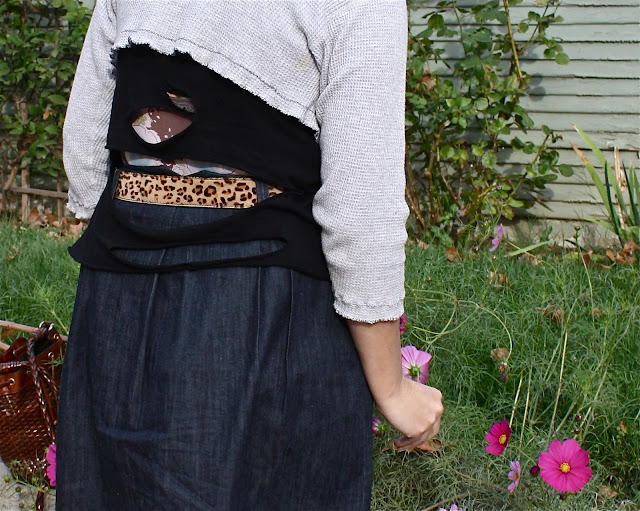 I haven't been able to shop much lately, as I'm on a very tight budget. Which hasn't bothered me, as I've got loads of vintage to dress up in, but what happens when certain strategic pieces, like, say, tops are either getting too small, or worn out? My t-shirts are stained (from work) and holy from age, and there's no replacement for the time being. What's a rosebud to do? Well, this t-shirt had a few bleach holes in it, so I decided to take it to town, and ripped holes all over it. It's fairly indecent without the camisole under it, but I kind of like the layered effect it creates. My leopard print belt peeps through, and the grey d.i.y. thermal shrug just seemed like a natural companion to the shredded tee. The outfit was then put together instinctively, so I'm not sure why the tights with strings and the brown woven bag seemed to fit with the ensemble but they did. And like me, the random overflow of cosmos growing in my neighbors yard just felt right.