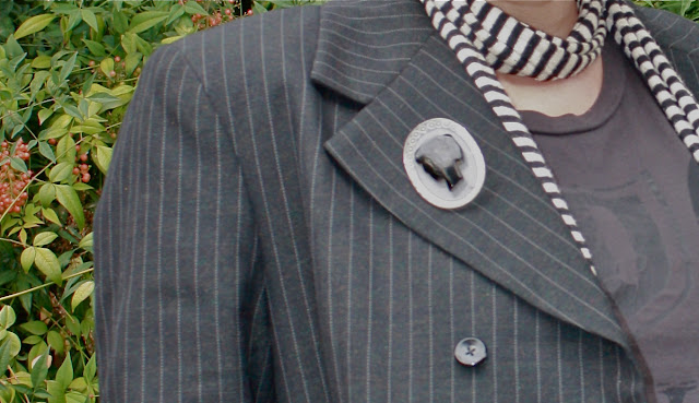 First of all let me say that I love your pin stripe blazer and the little brooch. Looks like a cameo but at the same time very different.