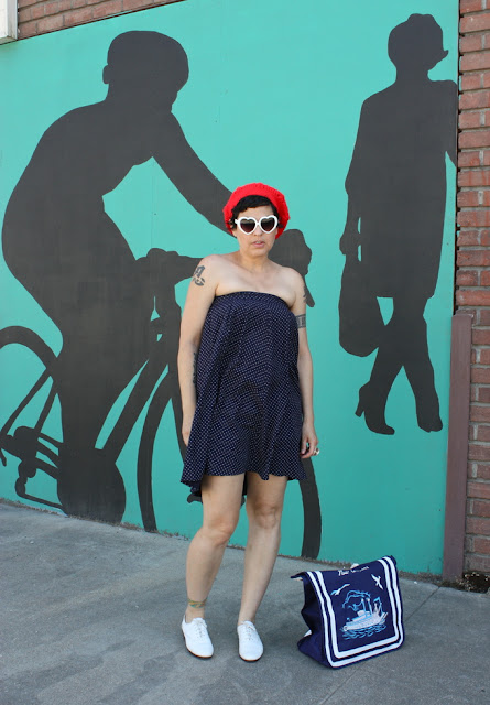 Little navy blue with white trim shorts were worn for modesty sake. Keeping it simple, I wore my red knit hat to cover my now rather alarmingly unruly growing out hair, fave heart sunnies, white brogues and this vintage souvenir totes regaling old New Orleans. Which is for sale by the way, $30 bucks including shipping, if in the United States.