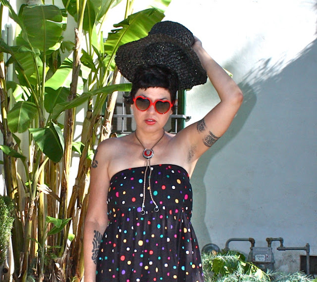 Vintage rayon is incredible. It is super breathable and cooling for hot Sacramento summer days. I've said it before but you can't layer in the summertime here, it is much to warm. Outfits get stripped down to the essentials: in this case hat, sunnies, dress, booties and uh, bolo tie. This is my newest find from the swanky Goodwill Boutique that opened in Midtown recently. I am digging my bolo.