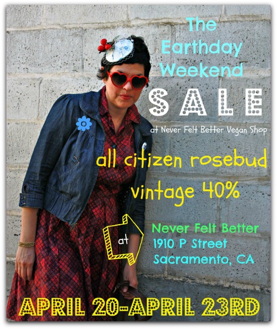 This Friday, Saturday, Sunday AND Monday, the Citizen is celebrating Earth Day Weekend by having a blow-out sale at Never Felt Better. Want to shop secondhand first? Do it vintage and vegan style, with the Citizen Rosebud vegan collection exclusively at the Never Felt Better Vegan Shop in Sacramento, California. Take FORTY PERCENT OFF all Citizen Rosebud vintage- so bike, walk or run over to Never Felt Better and grab that 1960's calico jumper you've had your eye on since last Monday.