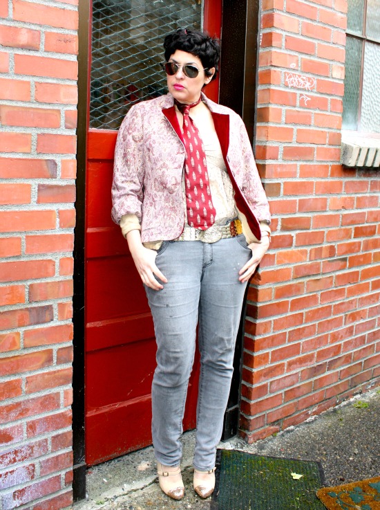 I knew when I left the house in this get-up, I wasn't going for invisible. In fact, I needed a rock-star day- you know, when ya wake up with the urge to put on heavy eye-liner and drink a beer with breakfast. I felt loosey-goosey, and so ambled out in the daylight in my "Lounge Lizard" attire. I was going for the jazz-musician-on-a-job-hunt look, and this Edun burgundy brocade blazer was the hair of the dog for me. With the saxaphone in the pawn shop, in bad need of a double Americano and a Lucky Strike, I'm lurking around the studio, trying to rustle up some crumb or my next gig. In reality, I'm headed to the corner market, and maybe a peek in The Daily Planet and see what's on the clearance racks. Sometimes, you want to dress for the life in your head, and not the one on the table.