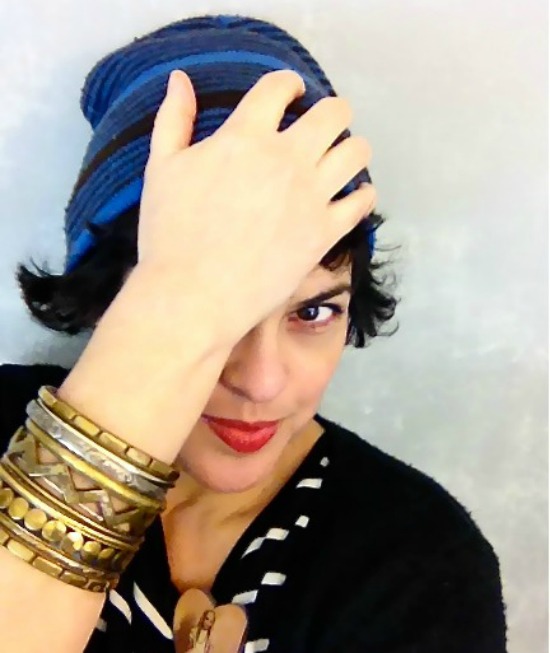 This outfit is not for the camera, or somebody else, but just what I wore as an online vintage seller, photographing items to list on eBay, wearing pretty much stuff that makes me happy. Like stripes. Or a hat to keep my head warm, hide my bad self-inflicted hair cut, and because I really like wearing hats. I also wore a bright blue, drug store mascara, worn as an homage to the Christian Dior electric blue mascara that I wore in high school (( hey, it was the eighties)). The long, thrifted denim skirt whispers "middle age librarian" but as a more comfortable version of jeans, has been a closet go-to lately.