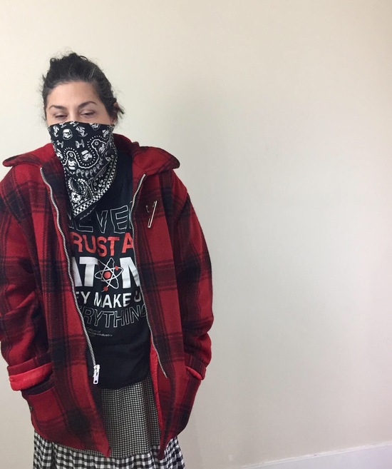 I took these photos the December of 2020, when it was cold enough to wear this toasty (and heavy) vintage hunter's jacket, and I felt really comfortable in this outfit of reds, black and white. There's nothing high fashion about this look, in fact it looks a bit proletarian to me, and I think I love it all the more for that.